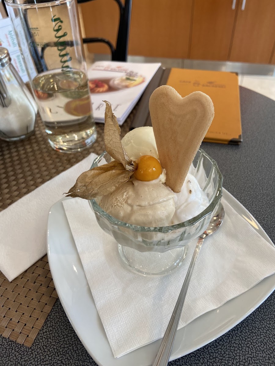 Schaut mickrig aus, der Service durch die " Praktikantin ist auch mickrig. Aber das Eis und der Mostschober sind absolute Highlights. Hingehen genießen und nicht über den Service ärgern.